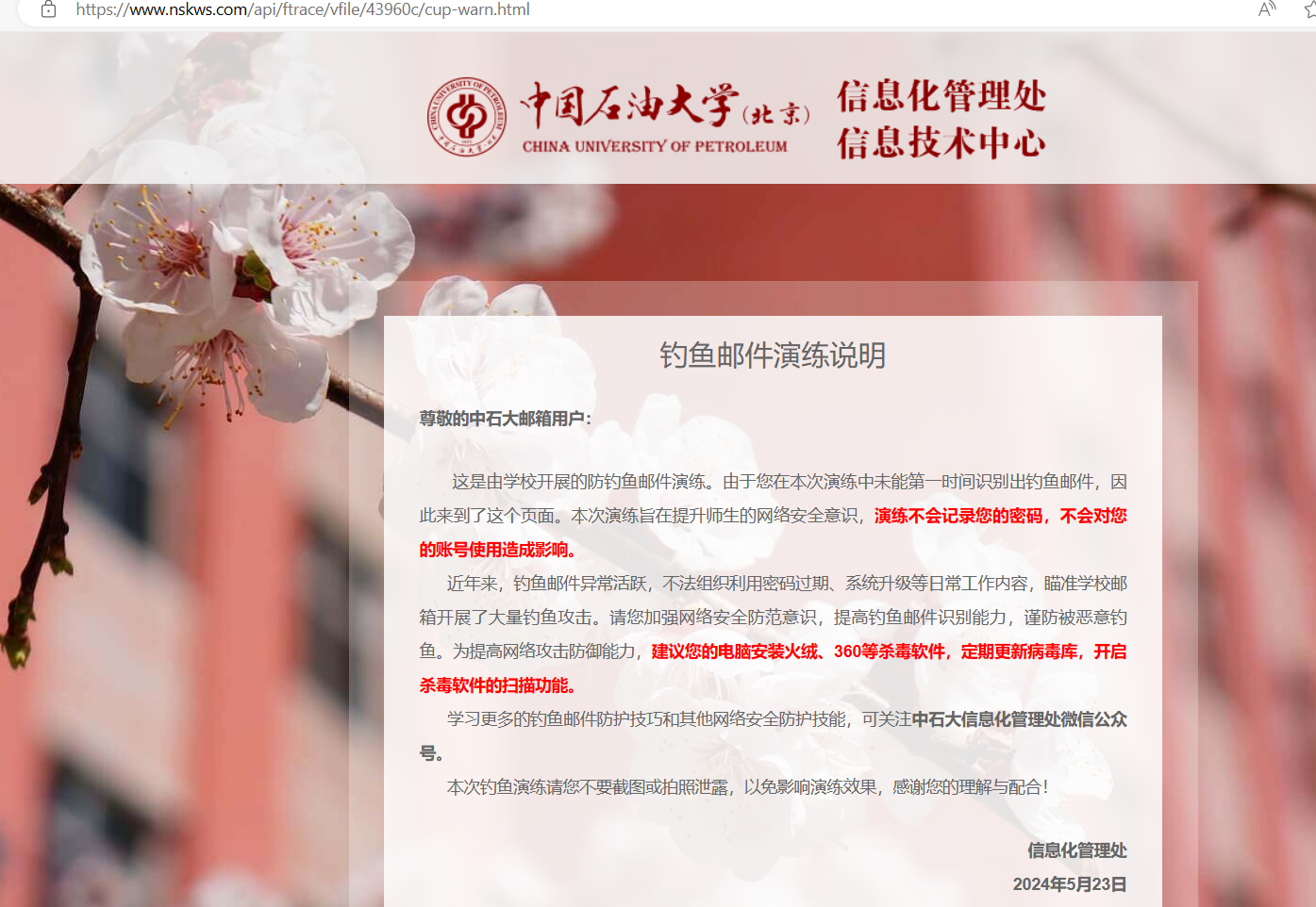 基于此,為提高師生對(duì)釣魚(yú)郵件的識(shí)別能力,提升師生網(wǎng)絡(luò)安全意識(shí),防范化解釣魚(yú)郵件風(fēng)險(xiǎn)隱患,保障學(xué)校系統(tǒng)業(yè)務(wù)數(shù)據(jù)和師生個(gè)人信息安全,信息化管理處積極響應(yīng)教育部定期開(kāi)展釣魚(yú)演練的號(hào)召,于5月13日至5月20日開(kāi)展了為期一周的釣魚(yú)安全演練。